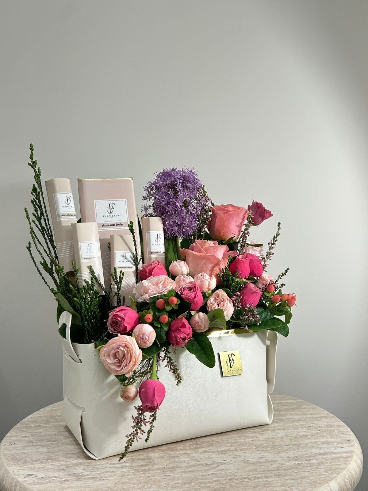 تنسيق الورد الوردي الجميل المزين بالرمادي، تنسيق أنيق يجمع بين فخامة الورد وذوق الشوكولاتة البلجيكية، هدية متكاملة تعبر عن الحب، التقدير، وكل المشاعر الحلوة، بتفاصيل راقية وتقديم يلفت النظر