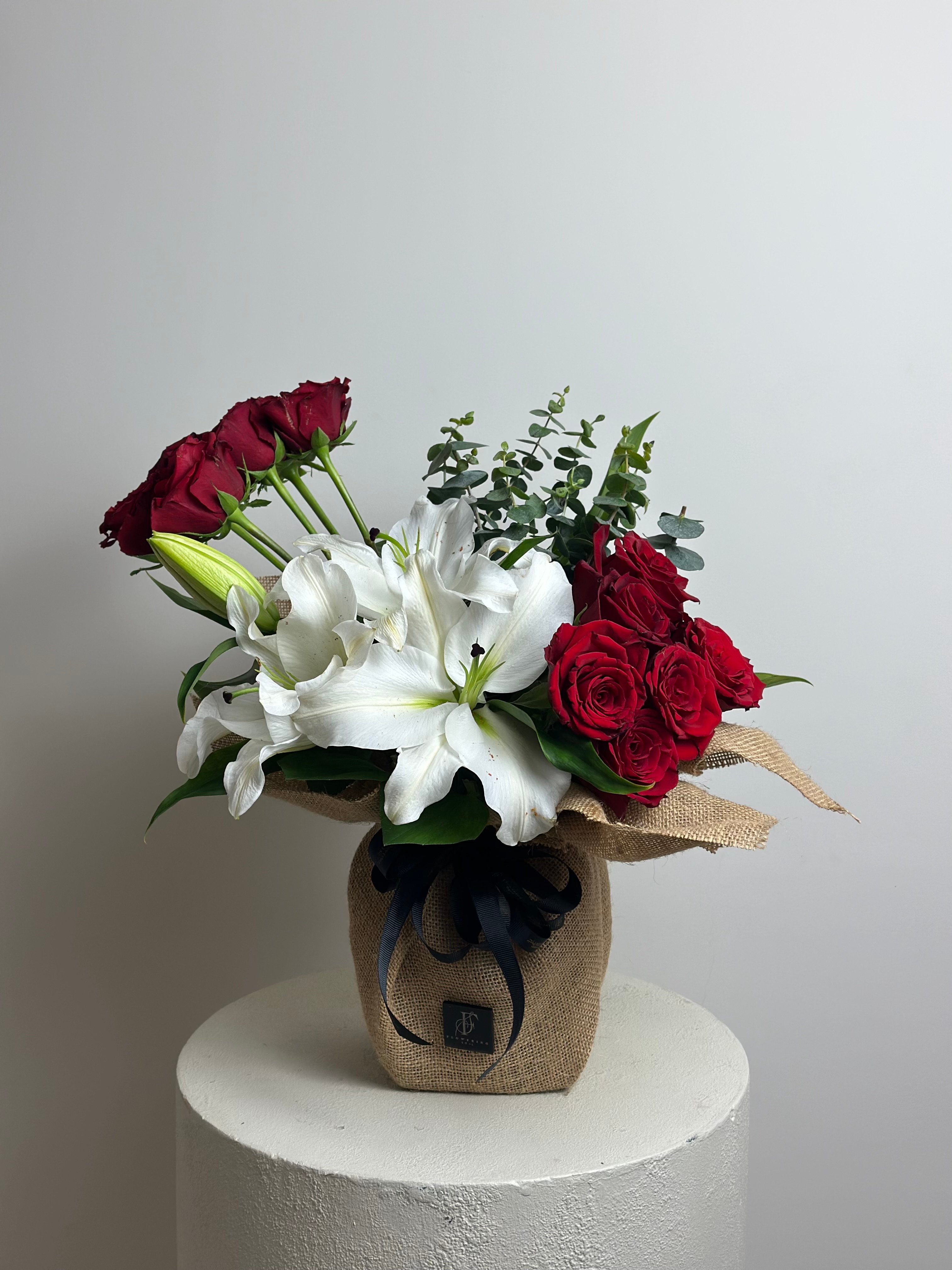 باقة أنيقة تجمع بين الورد الأحمر وزنابق بيضاء بلمسة طبيعية، مثالية للإهداء والتعبير عن المشاعر بأسلوب راقٍ